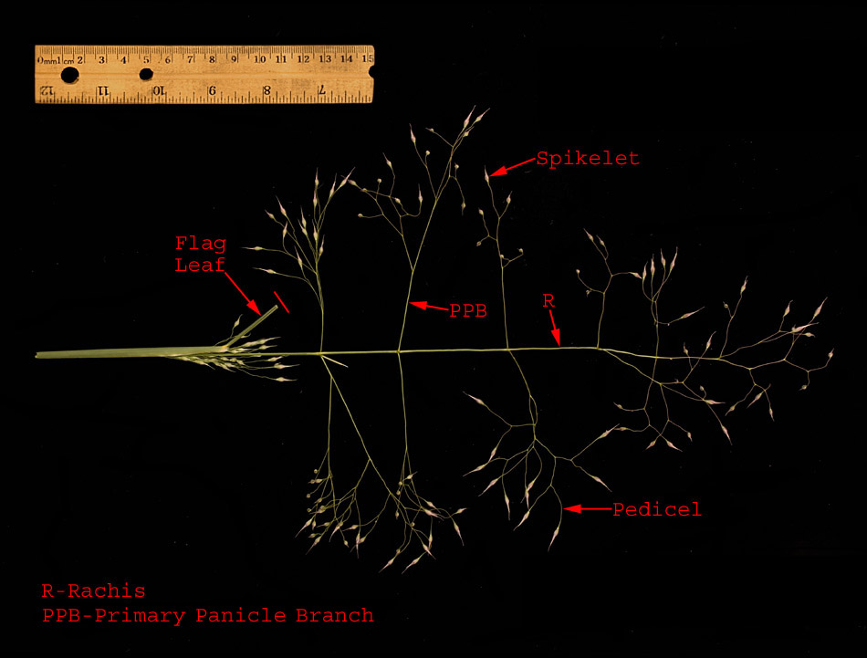 Most of the flag leaf has been removed from this specimen.  Note the inflorescence is a diffuse panicle with divaricately forked branches.