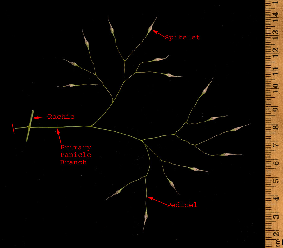 There is another branch opposite to the one pictured which has been removed from this specimen. Note the inflorescence is a diffuse panicle with divaricately forked branches. The spikelets are solitary at the tips of long, spreading pedicels.