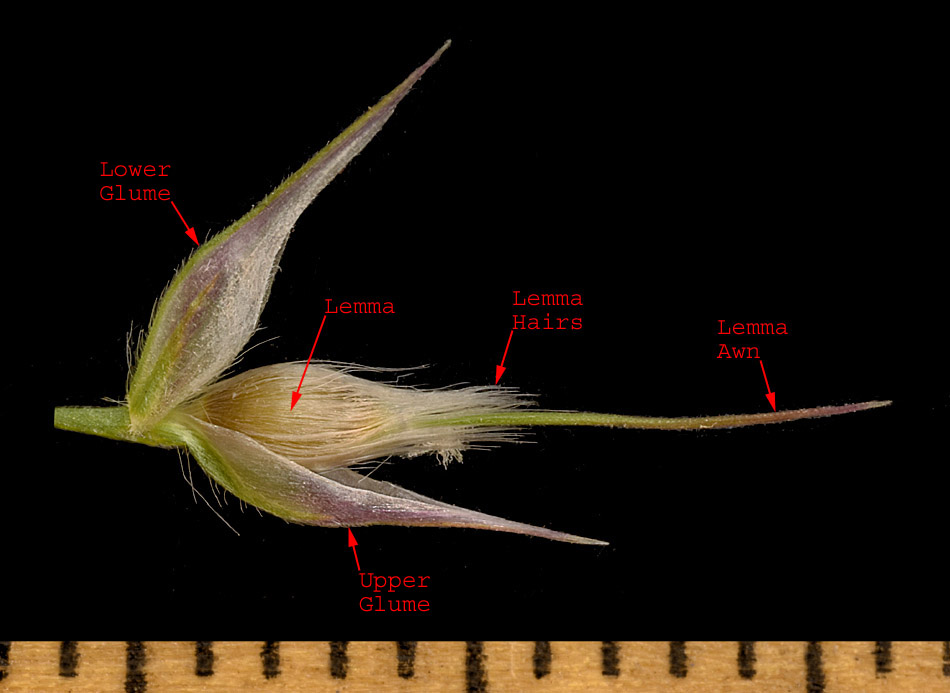 The glumes are papery and sac-shaped at base, and abruptly narrow to a long-pointed (but not filiform) tip. They are subequal and 5-9 mm long. The lemmas are densely and evenly pilose with hairs 2.5-6 mm long. The tips of the lemma hairs are visible between the glume tips.