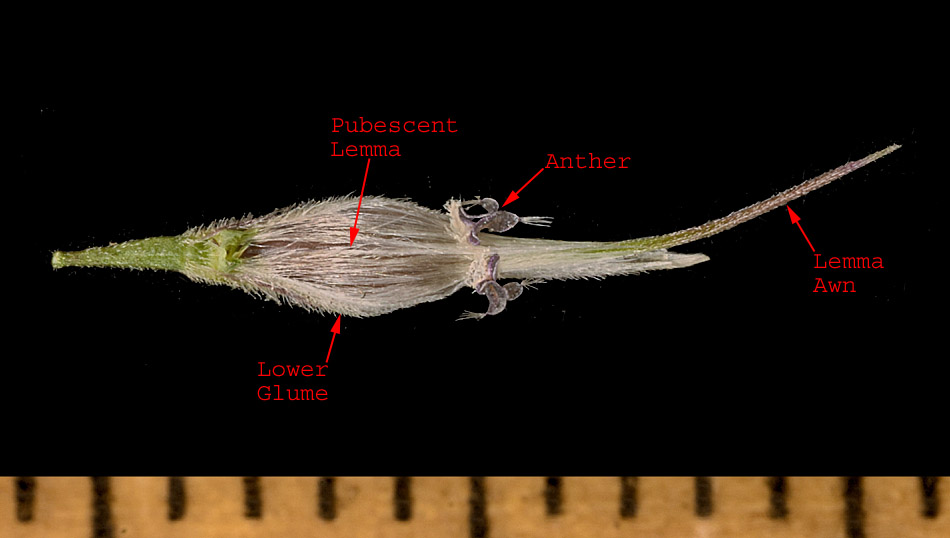 The upper glume has been removed from this specimen to reveal the lemma. The lemmas are densely and evenly pilose with hairs 2.5-6 mm long. Each half (theca) of the anther is penicillate (equipped with a brush-like tuft of hairs).