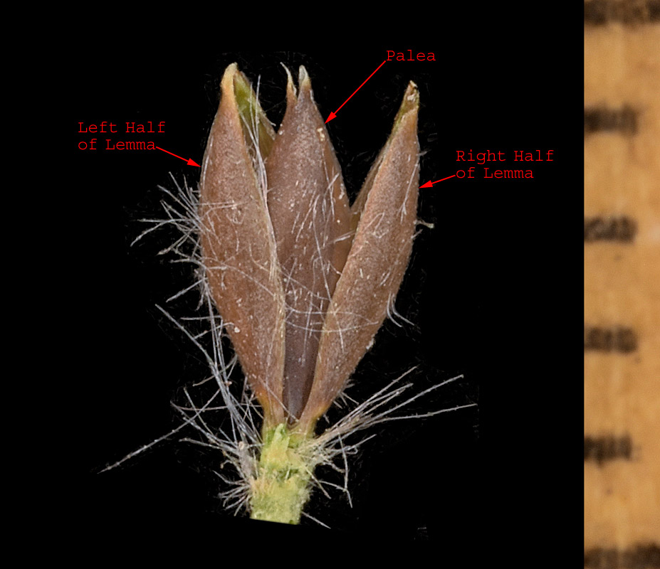 Note that normally the lemma is awned and pilose and surrounds the palea.  However, the awn and most of the pubescence have been manually removed, and the lemma has been split in two and spread apart to reveal the palea.  Note the palea is glabrous and about equal to the lemma in length and width. The lemma is 3-4.5 mm long not including the awn.
