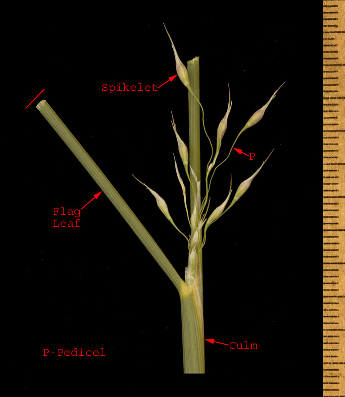 Glumes papery, sac-shaped at base and abruptly narrowing to a long-pointed tip; lemmas densely and evenly pilose with hairs 2.5-6 mm long, the tips of the hairs visible between the glume tips; lemma awns 3-6 mm long, caducous, straight, not twisted at base; paleas glabrous and about equal to lemmas in length and width; panicles diffuse with divaricately forked branches, and spikelets solitary at tips of long, spreading pedicels; NOT [Glumes thinly membranous, hyaline distally, lanceolate, not sac-shaped at base; lemmas pubescent with hairs 2 mm long at most and not visible between the glume tips; lemma awns >= 15 mm long, persistent, weekly twice-geniculate, twisted below; paleas pubescent and at most 2/3 the lemma length and much narrower than the lemmas; panicles not as above.]