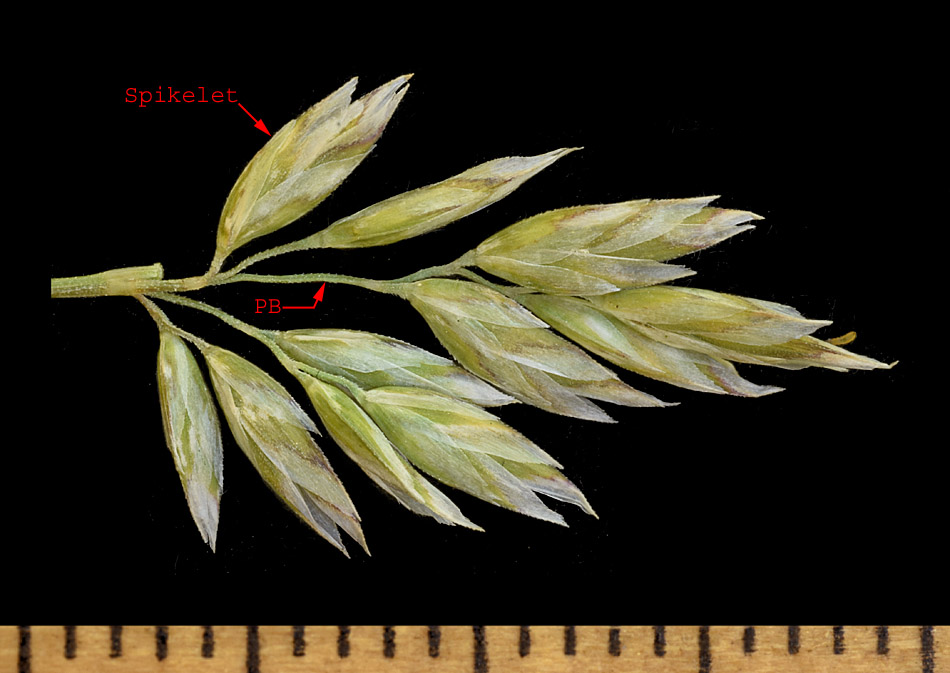 The lowest panicle branches in these specimens range up to about 2 cm long (slightly longer than the 1.7 cm stated in the publication below) and contain 2-5 spikelets mostly born at mid-length or beyond. Note that the lowest panicle branches of P. fendleriana are 1-8 cm long and contain 3-15 (25) spikelets borne to near the base.