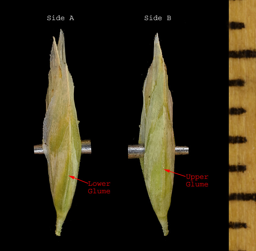 Pictured above are two views of the same spikelet. The views are of the narrow sides of the spikelet to depict the two glumes. The upper glume is longer than the lower glume.
