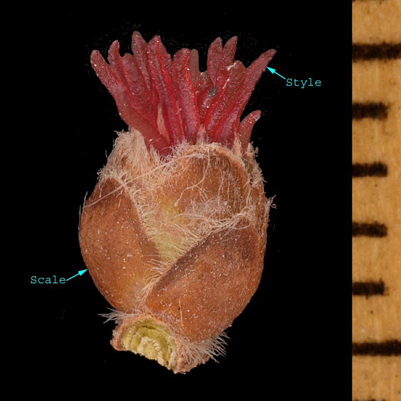 Fruit a nut over 1 cm long, enclosed in a tube-like involucre; bud scales and bracts of staminate catkins with coarse, straight, appressed hairs; pistillate catkins few-flowered and borne on short bud-like branches that are distal to the staminate catkins and visible primarily as reddish styles projecting from the bud at anthesis; NOT [Fruit a samara, much shorter than 1 cm and subtended by a flat scale; bud scales and bracts of staminate catkins not coarsely hairy; pistillate catkins many-flowered, erect or pendulous, often borne on short shoots proximal to the staminate catkins.]