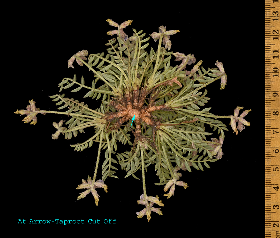Most of the taproot has been removed from this specimen. Note the plants are caespitose at the base, with both spreading and erect stems 2-10 cm long.