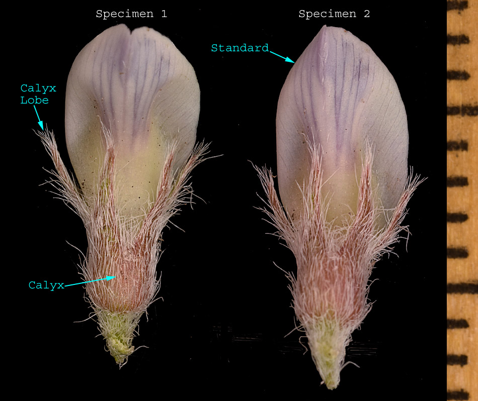 The calyx is in focus in the left hand specimen and the standard is in focus in the right hand specimen.