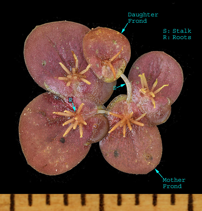 The distal portions of the roots have been removed from this specimen in order to clearly expose the undersides of the fronds. Note there is more than one root per frond.