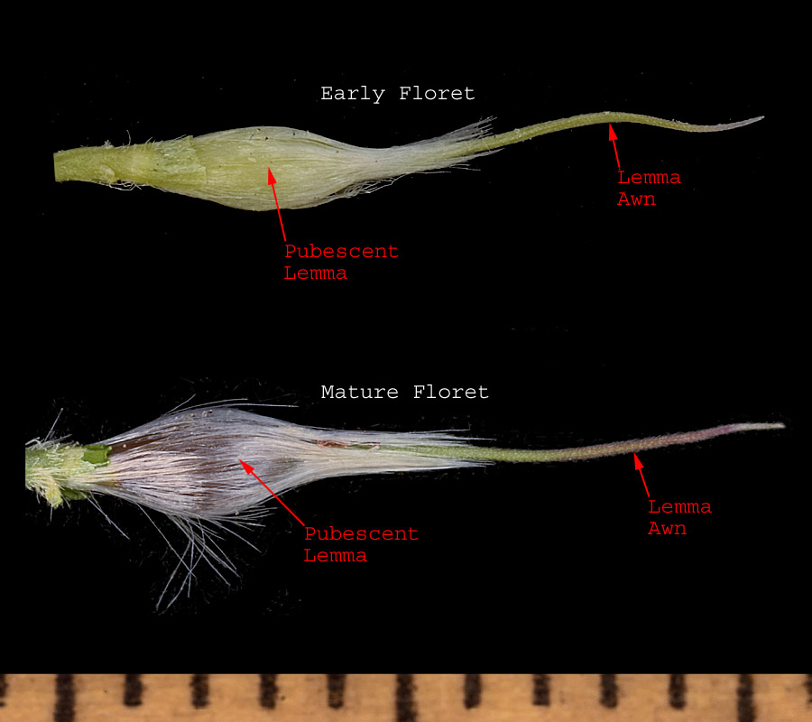 The lemmas are 3-4.5 mm long not including the awn.  They are densely and evenly pilose with hairs 2.5-6 mm long.