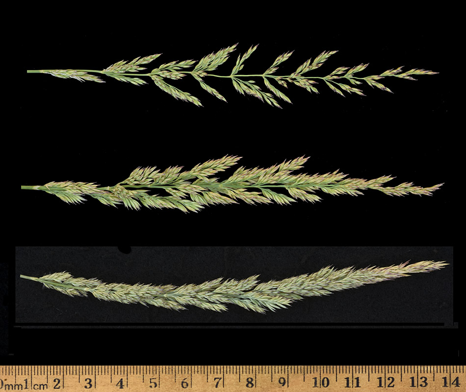 The bottom-most specimen is more mature than the other two. Note the inflorescence is a panicle (0.6) 1-2 (2.5) cm wide, whereas it is (1) 2-4 (8) cm wide in C. canadensis. The longest panicle branch is 5 cm or less, whereas the longest branch of C. canadensis is usually more than 5 cm.