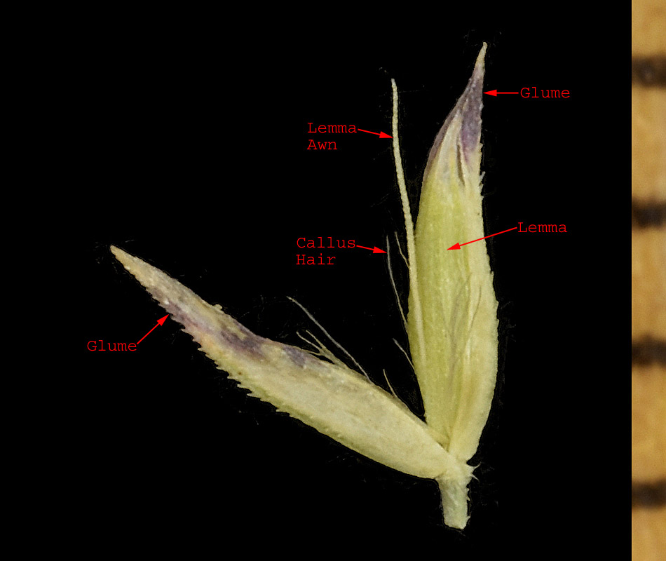 The lemma awn is straight, attached to the lower 1/2 of the lemma and is not or only slightly exserted from the glumes. Note the awn is stout and easily distinguishable from the callus hairs, while the awn of C. canadensis is slender and scarcely distinguishable from the callus hairs.
