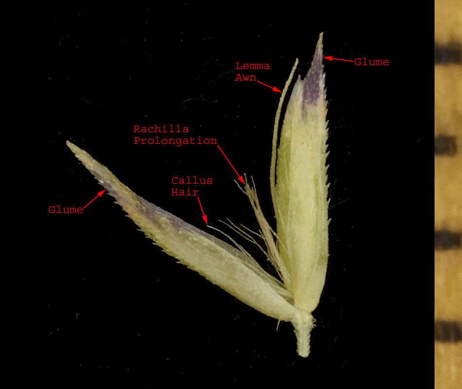 The lemma awn is straight, attached to the lower 1/2 of the lemma and is not or only slightly exserted from the glumes. Note the awn is stout and easily distinguishable from the callus hairs, while the awn of C. canadensis is slender and scarcely distinguishable from the callus hairs. Note also the pubescent rachilla prolongation.