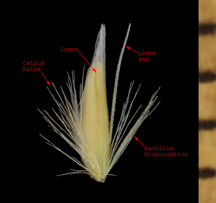 The lemma awn is straight and attached to the lower 1/2 of the lemma. Note the awn is stout and easily distinguishable from the callus hairs, while the awn of C. canadensis is slender and scarcely distinguishable from the callus hairs. Note also the callus hairs of this species are variable in length with some 3/4 to slightly longer than the lemmas, whereas in C. canadensis they are mostly as long as or longer than the lemmas.