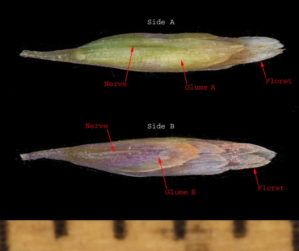 The picture shows two views of the same spikelet. The glumes are 2-5 (6) mm long with 1-3 nerves. There are usually two florets in each spikelet.