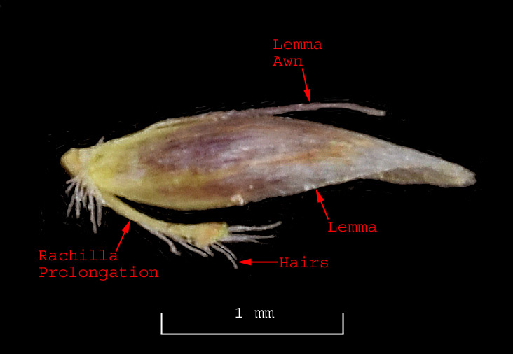 The rachilla has an extension called the rachilla prolongation, the tip of which contains a tuft of hairs.