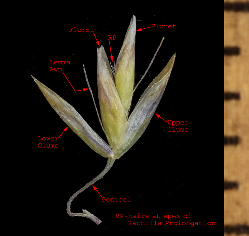 The glumes are 2-5 (6) mm long. There are usually two florets in each spikelet. The lemma awn is attached near the base of the lemma and exceeds the lemma by no more than 1 mm. The tuft of hairs at the apex of the rachilla prolongation can be seen poking out between the florets.