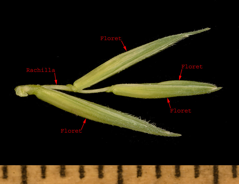 The glumes have been removed from the spikelet pictured here. In addition, some of the florets have been manually spread apart.