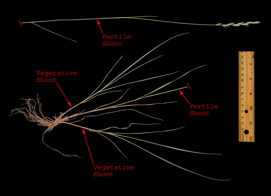 The culms grow in loose tufts from slender, creeping rhizomes.  However, the rhizomes are often not collected and are not evident in this specimen.  Two vegetative shoots and one fertile shoot are pictured here.  The fertile shoot has been cut into two pieces.