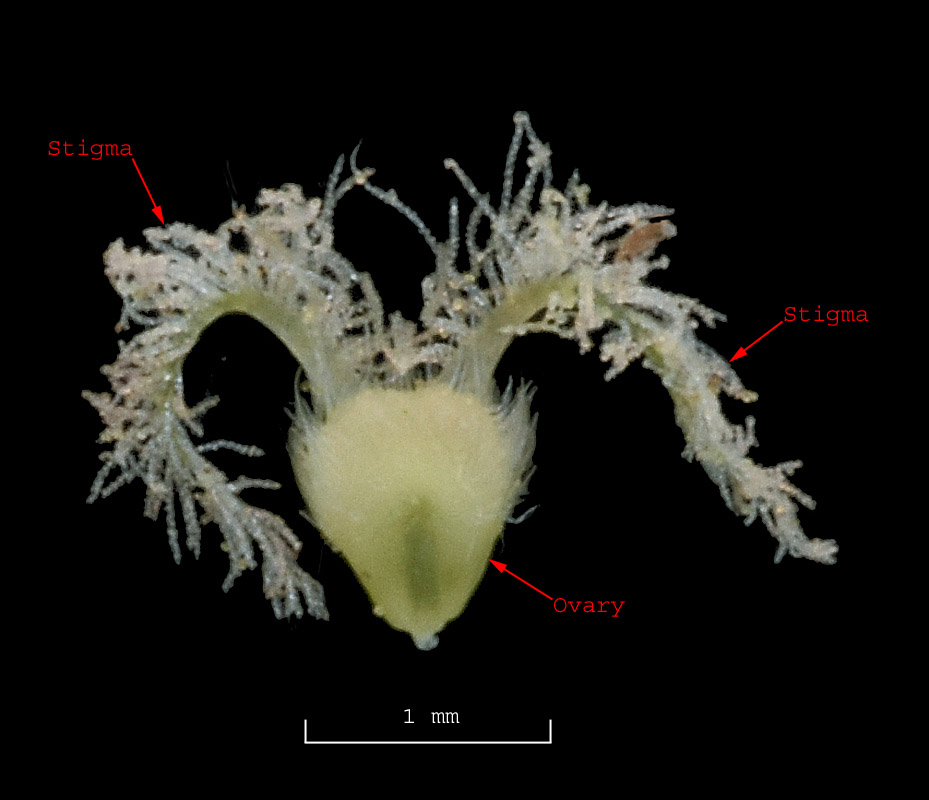 of a sessile fertile spikelet, a hairy pedicel with or without a sterile