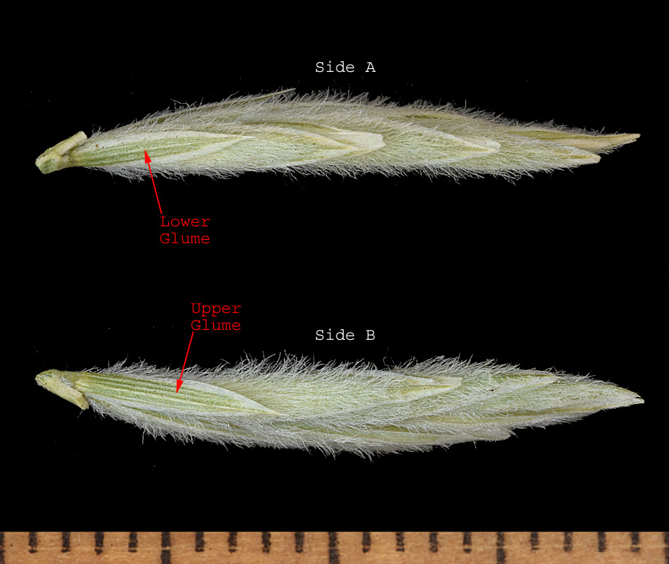 The lower glume is 1/2 to 2/3 as long as the adjacent lemma. The lemma is unawned or with a straight awn up to 2 mm long.  Note the lemma surface is densely hairy with flexible hairs of varying lengths but at least some 1 mm long or longer - a feature of subsp. psammophilus (see key to subspecies at the bottom of the page).