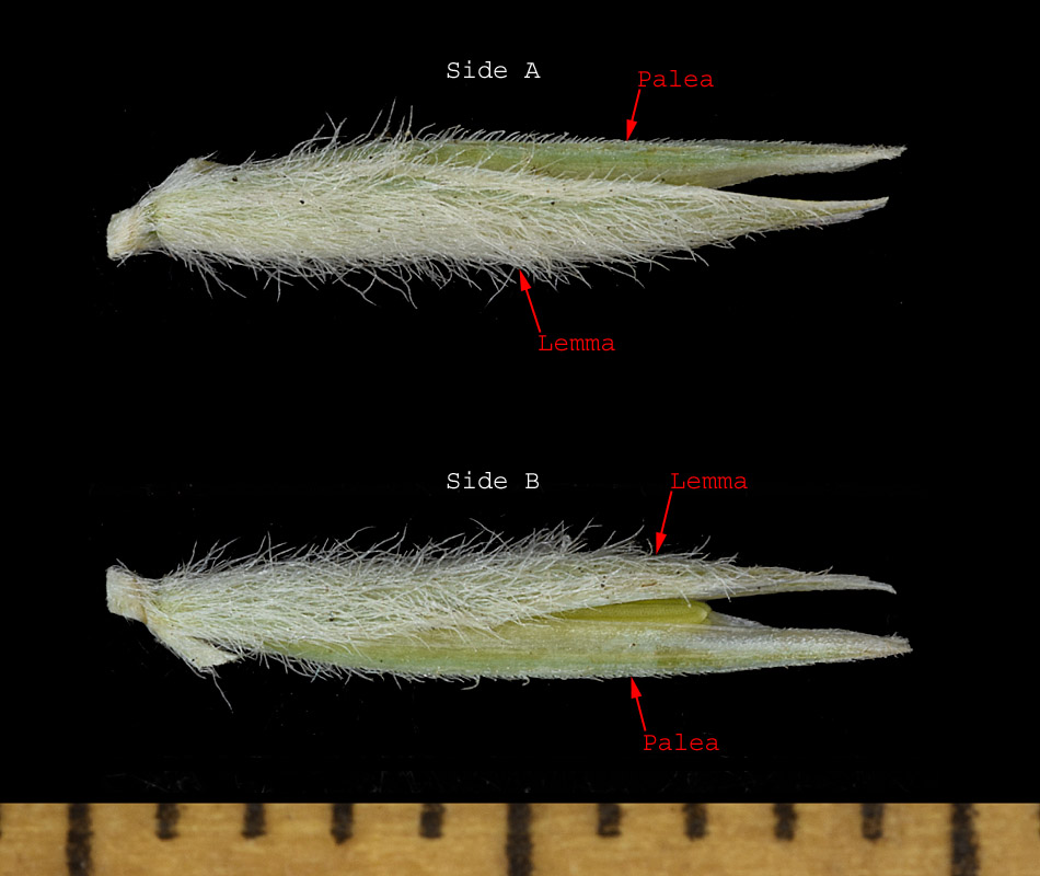 The lemma is unawned or with a straight awn up to 2 mm long. Note the lemma surface is densely hairy with flexible hairs of varying lengths but at least some 1 mm long or longer - a feature of subsp. psammophilus (see key to subspecies at the bottom of the page).