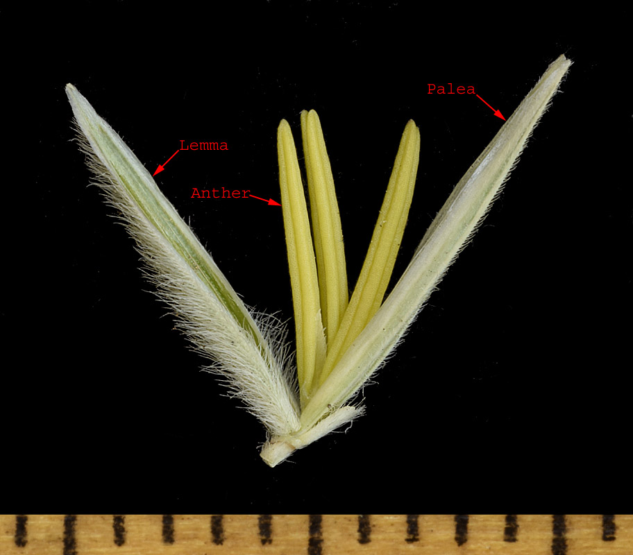 The lemma and palea have been manually pulled away from one another to reveal the flower inside.