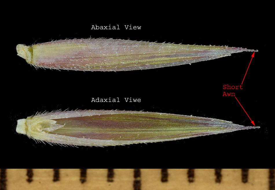 The lemma is unawned or with a straight awn up to 2 mm long. Note the lemma surface is not evenly pubescent despite the presence of some scattered hairs  - a feature of subsp. riparius (see key to subspecies at the bottom of the page).