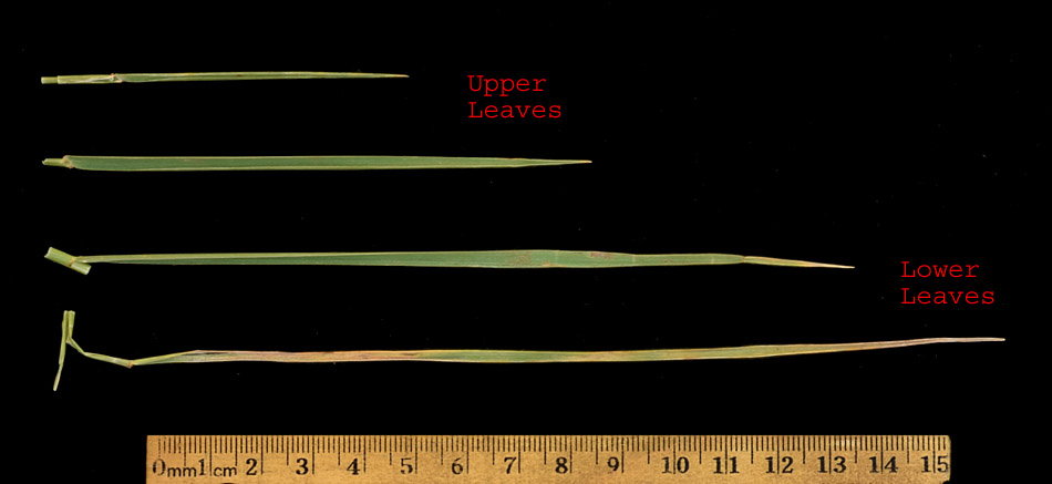 Leaf blades 2-8 mm wide, usually straight and ascending, somewhat concentrated near base, occasionally subbasal; glumes 1.8-2.3 mm wide, lanceolate to narrowly elliptic, widest near the middle; glume awns to 11 mm long; auricles rudimentary or absent, if present then < 1 mm long; anthers 1.2-2.5 (3) mm long; NOT [Leaf blades 4-17 mm wide, usually lax, evenly distributed along the culms; glumes 0.6-1.5 (2) mm wide, linear-lanceolate to lanceolate, widest below the middle; glume awns to 5 (9) mm long; auricles usually present, to 2.5 mm long; anthers 1.5-3.5 mm long]