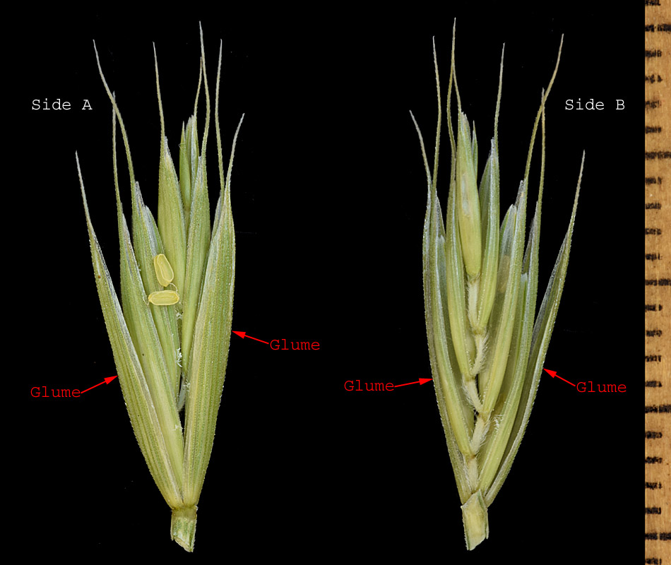 The glumes are subequal, unawned or awned, and 3/4 as long as to exceeding the lemmas. The glumes are equipped with 3-7 evenly spaced and parallel nerves that are often conspicuously ridged. The lemmas are unawned or awned.  Note the small size of the anthers.