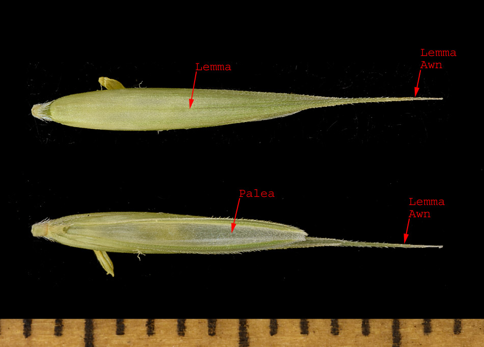 Pictured here are the lemma and palea from a single floret. Note the lemma can be unawned or awned.