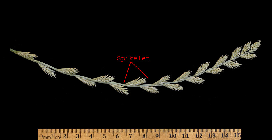 The inflorescence is a distichous terminal spike with 5-37 spikelets. Note the spikelets are positioned edgewise to the rachis, this is to say the flattened spikelets are in the same plane as the rachis.