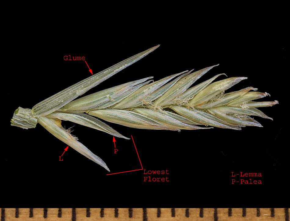 Note the lateral spikelets have only one glume (the lower glume is missing), while the terminal spikelet has both glumes. The upper glume on lateral spikelets is 3.5-15 mm long and is (1/3) 1/2 to 3/4 as long as to occasionally slightly longer than the spikelet. Each spikelet has (2) 5-9 (10) florets.  This specimen has about 10.