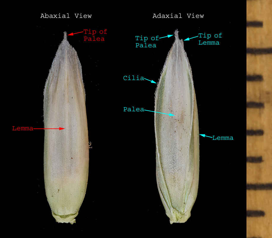 The lemmas of the lower florets are 3.5-9 mm long. The lemma is usually unawned but may posses an awn up to 8 mm long, attached 0.2-0.7 mm below the apex. The paleas are slightly shorter than to slightly longer than the lemmas.
