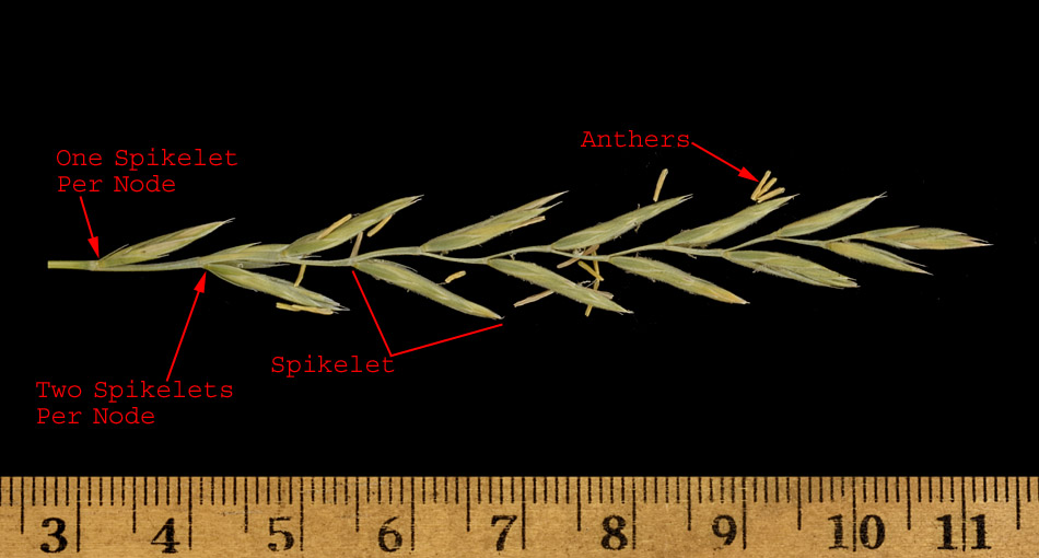 Spikelets 1 per node, occasionally 2 at some nodes; NOT  [Spikelets 2 or more per node, occasionally 1 at some nodes]
