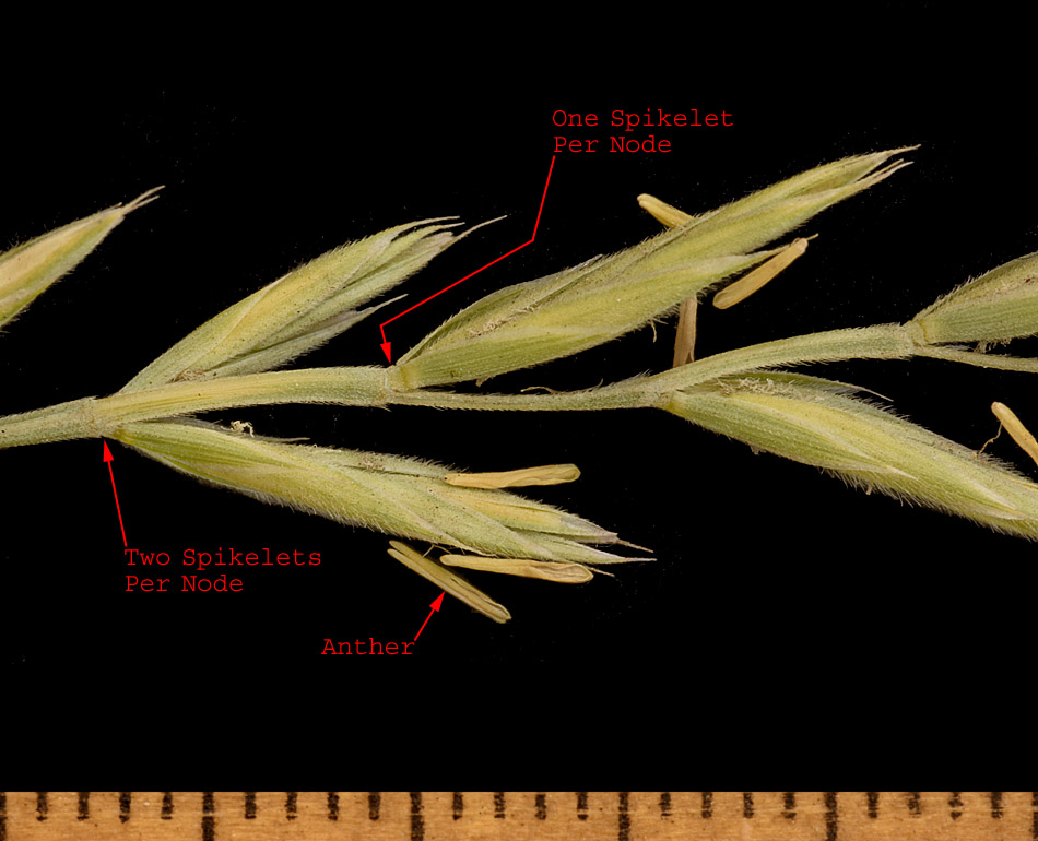 Spikelets 1 per node, occasionally 2 at some nodes; NOT  [Spikelets 2 or more per node, occasionally 1 at some nodes]
