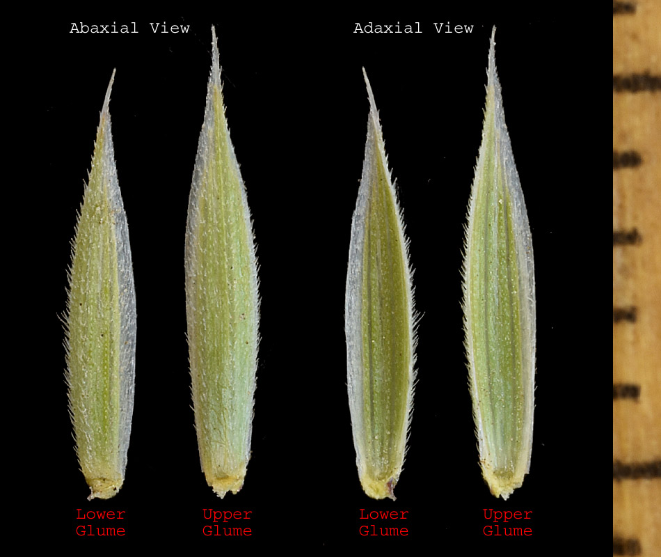 mid-nerve extending all the way to the apex. Note that these glumes are less