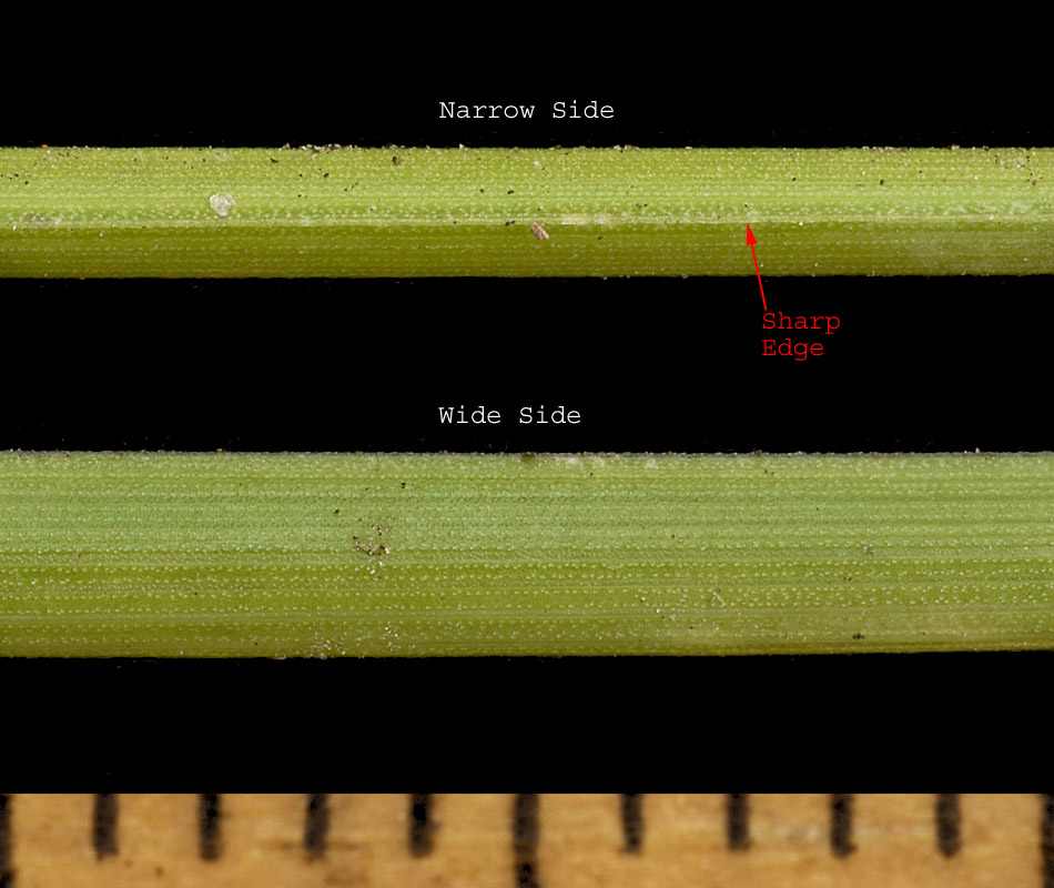 Note the culm is strongly compressed and sharply 2-edged distally.  This specimen is just below the uppermost leaf.