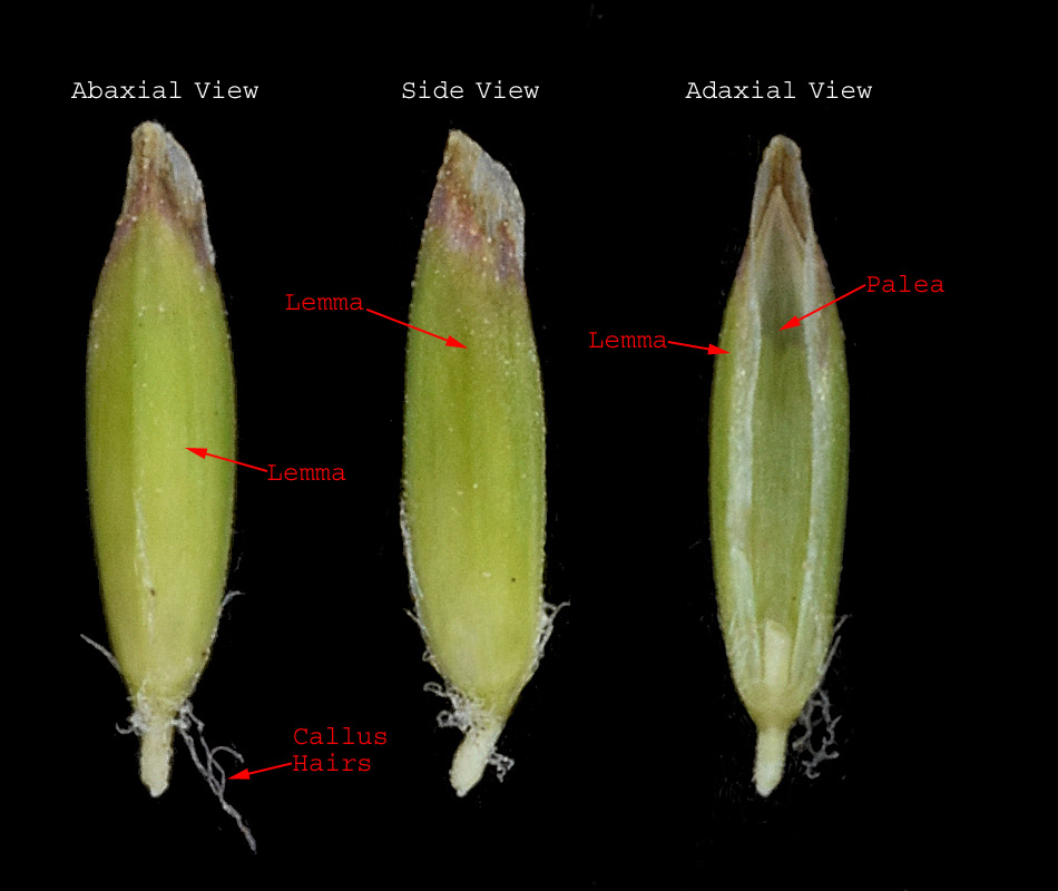 Lemmas and lemma awns not as below; if lemma indurate and enveloping the floret, then glumes distinctly dorsally compressed and calluses glabrous (as in Milium); NOT [Lemmas stiff to indurate, firmer than the glumes, surrounding the palea and often overlapping along the margins, closed at the tip as well as at the base, often pubescent; lemma awns (caducous or wanting in some species) terete and encircled at the base by the closed tip of the lemma; calluses usually pubescent, rarely glabrous]