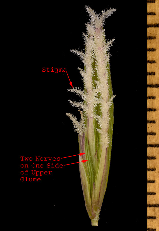 The inflorescence is a panicle. The primary panicle branches are spike-like with sessile to subsessile, closely imbricate, regularly-spaced, parallel spikelets all directed toward 1 side of the branch. The primary branch is actually 3-sided with a row of spikelets attached to two of the three sides, and the third side flat. The spikelets are sessile in the upper branches and stalked in the lower ones.
