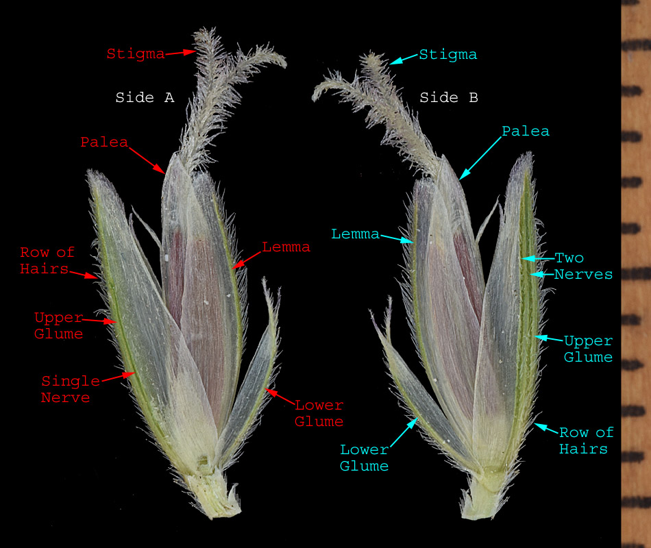Note the glumes are unequal. The lower glume is shorter than the lemma and 3-6 (7) mm long. The upper glume 6-10 mm long, unawned or awned, with the awns <= 1 mm long if present at all.  The glume keels are slender, ciliate with a +/- continuous line of pilose or hirsute hairs 0.2-0.5 mm long, whereas the keels of S. pectinata are prominently thick, rounded, harshly serrulate-hispid with firm hairs up to 0.3 mm long.