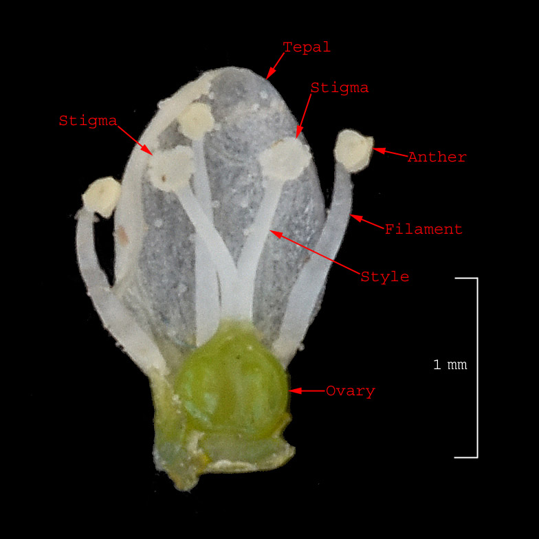 Each flower has two (occasionally three) styles. Note the styles are less than 2 mm long.