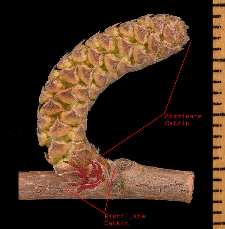 Fruit a nut over 1 cm long, enclosed in a tube-like involucre; bud scales and bracts of staminate catkins with coarse, straight, appressed hairs; pistillate catkins few-flowered and borne on short bud-like branches that are distal to the staminate catkins and visible primarily as reddish styles projecting from the bud at anthesis; NOT [Fruit a samara, much shorter than 1 cm and subtended by a flat scale; bud scales and bracts of staminate catkins not coarsely hairy; pistillate catkins many-flowered, erect or pendulous, often borne on short shoots proximal to the staminate catkins.]