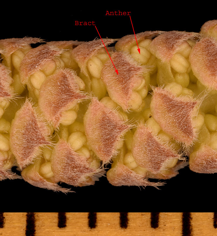 bracts of staminate catkins with coarse, straight, appressed hairs;