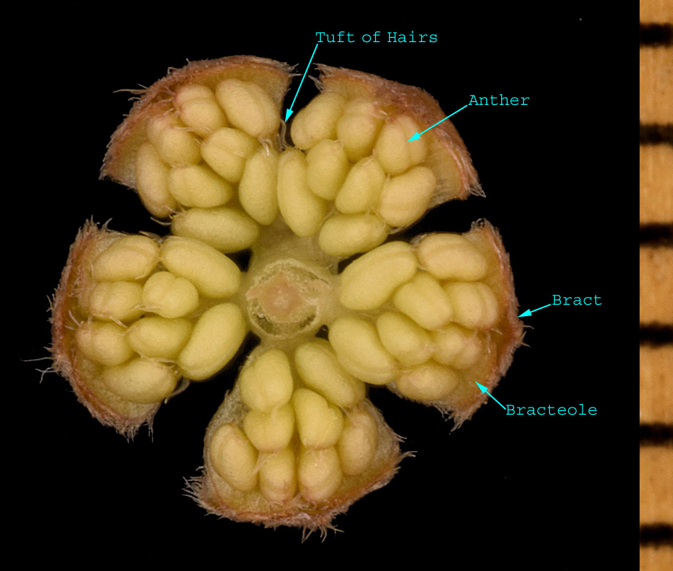 anther has a tuft of hairs at its apex. Note also the margins of both the bract
