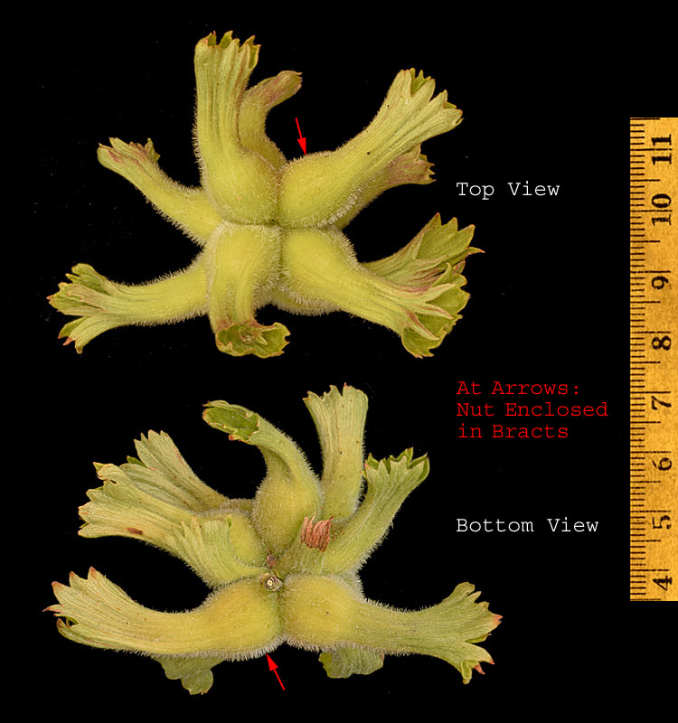 2-3 bracts; NOT [Fruits nuts surrounded or partly surrounded by a
