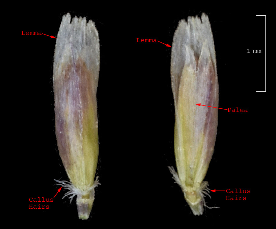 The picture shows two views of the same floret. The lemmas 2-3.5 (4) mm long. The lemma apices are truncate-erose and 4-toothed.  Callus hairs are present but are mostly less than 2 mm long. The lemma awn is not visible here.