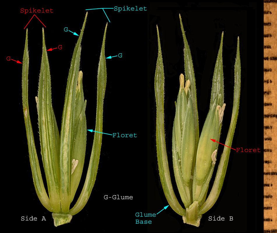 Two sides of the same node are pictured here. Note there are two spikelets per node. Turquoise