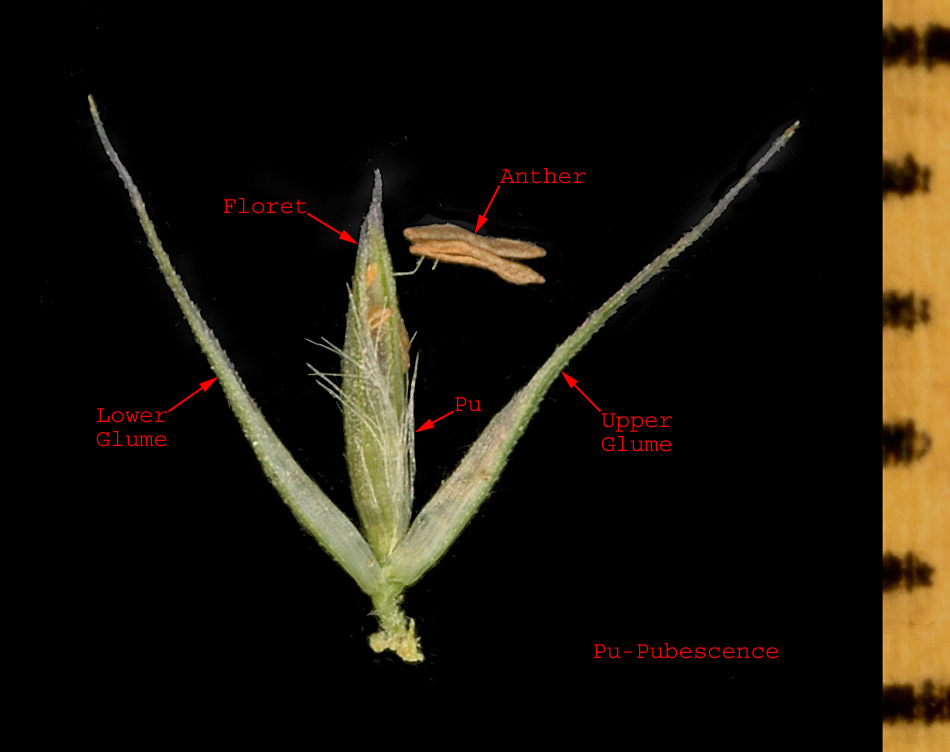 Each spikelet contains a single floret.  Note the callus and proximal portions of the lemma are pilose with hairs up to 1.2 mm long.  Note also the anther is >= 0.8 mm long.