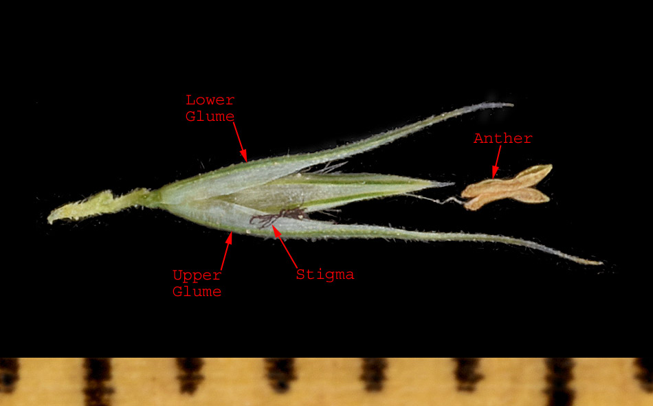 Glumes (including awns) 3-8 mm long, distinctly longer than the lemma; lemma hairs up to 1.2 mm long; NOT [Glumes (including awns) 1.5-3.7 mm long, <= the lemma; lemma hairs up to 0.7 mm long]