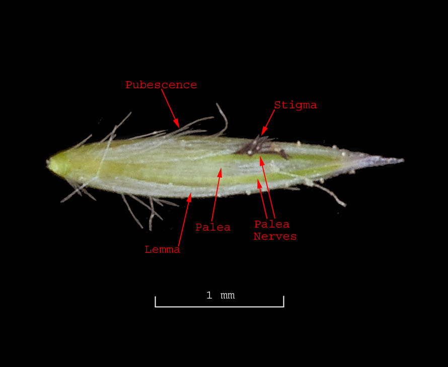 The proximal portion of the lemma is pilose with hairs up to 1.2 mm long. Note the palea is 2-nerved.